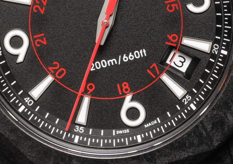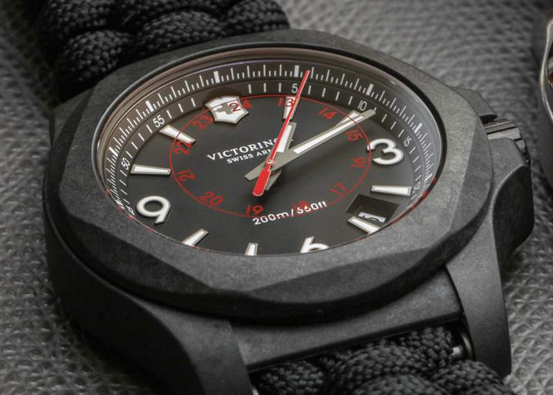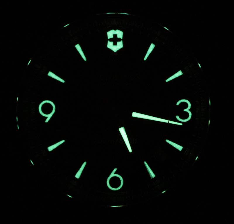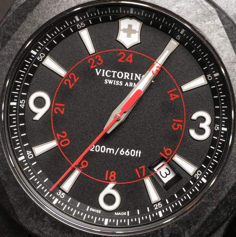 Luminant 既適用于迷人(且尺寸適中)的指針,也適用于時(shí)標(biāo)。雙排較小增量的標(biāo)記排列在法蘭環(huán)上。較低的用于秒針(我很高興地報(bào)告,我的 Victorinox Swiss Army INOX Carbon 有一個(gè)與標(biāo)記完美對(duì)齊的秒針),而上面的只是為了風(fēng)格 – 因?yàn)檫@些將用于計(jì)時(shí)碼表,并不是對(duì)這個(gè)運(yùn)動(dòng)有用的標(biāo)記。這并不是真正的缺點(diǎn),而只是計(jì)時(shí)純粹主義者會(huì)注意到的一個(gè)小怪癖。
