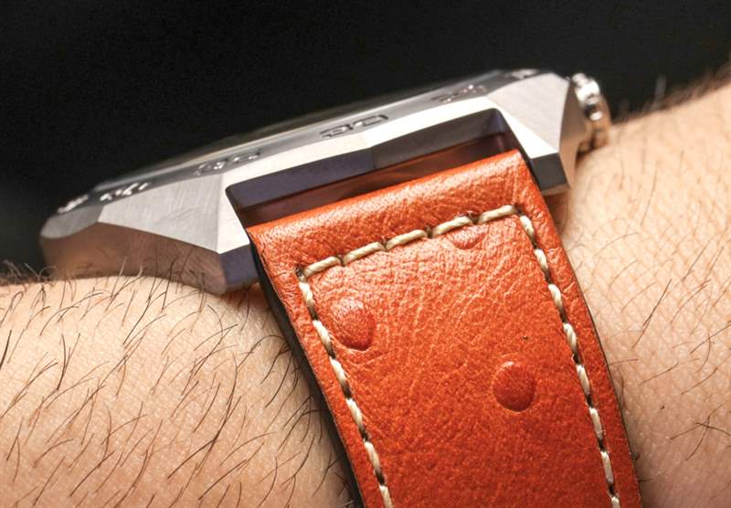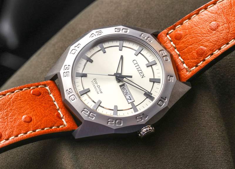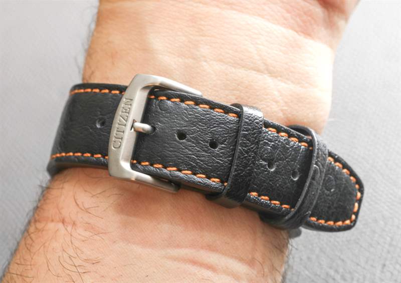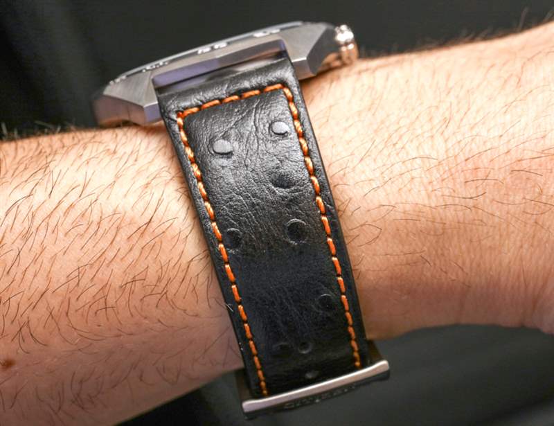 這讓我對那些和我一樣喜歡 Eco-Drive Super Titanium 的人提出了一個奇怪的建議。獲取 AW0060-03E 表盤,然后是手鐲上的其中一個型號(例如 AW0060-54A),然后將手鐲換成皮革表帶。表帶實(shí)際上很好看,但你可能知道我是手鐲的傻瓜,所以我更喜歡它。兩條皮表帶外側(cè)有鴕鳥紋,看起來還不錯,不像廉價的假鱷魚紋。在評測過的手表上,表帶是黑色的,帶有橙色縫線以匹配秒針。請注意與表殼設(shè)計(jì)主題相匹配的定制表帶扣。